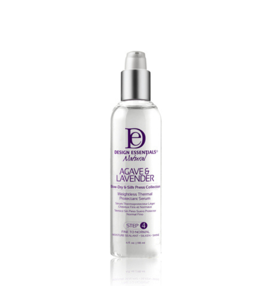 Design Essentials® Agave & Lavender Weightless Thermal Protectant Serum provides exceptional heat protection and creates a silky-smooth finish without weighing down fine to normal hair. The lightweight formula seals moisture in the hair cuticle, adds a brilliant shine and an additional layer of protection when silk pressing and thermal styling hair.