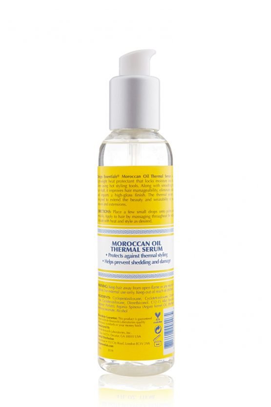 Design Essentials® Moroccan Oil Thermal Serum is a lightweight heat protectant that locks moisture into hair when using hot styling tools. Along with smoothing the hair shaft, it improves hair manageability, eliminates static and imparts a high gloss finish. The thermal serum is designed to extend the beauty and wearability of your weaves and extensions.